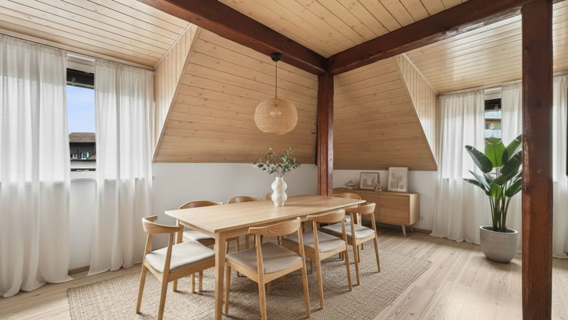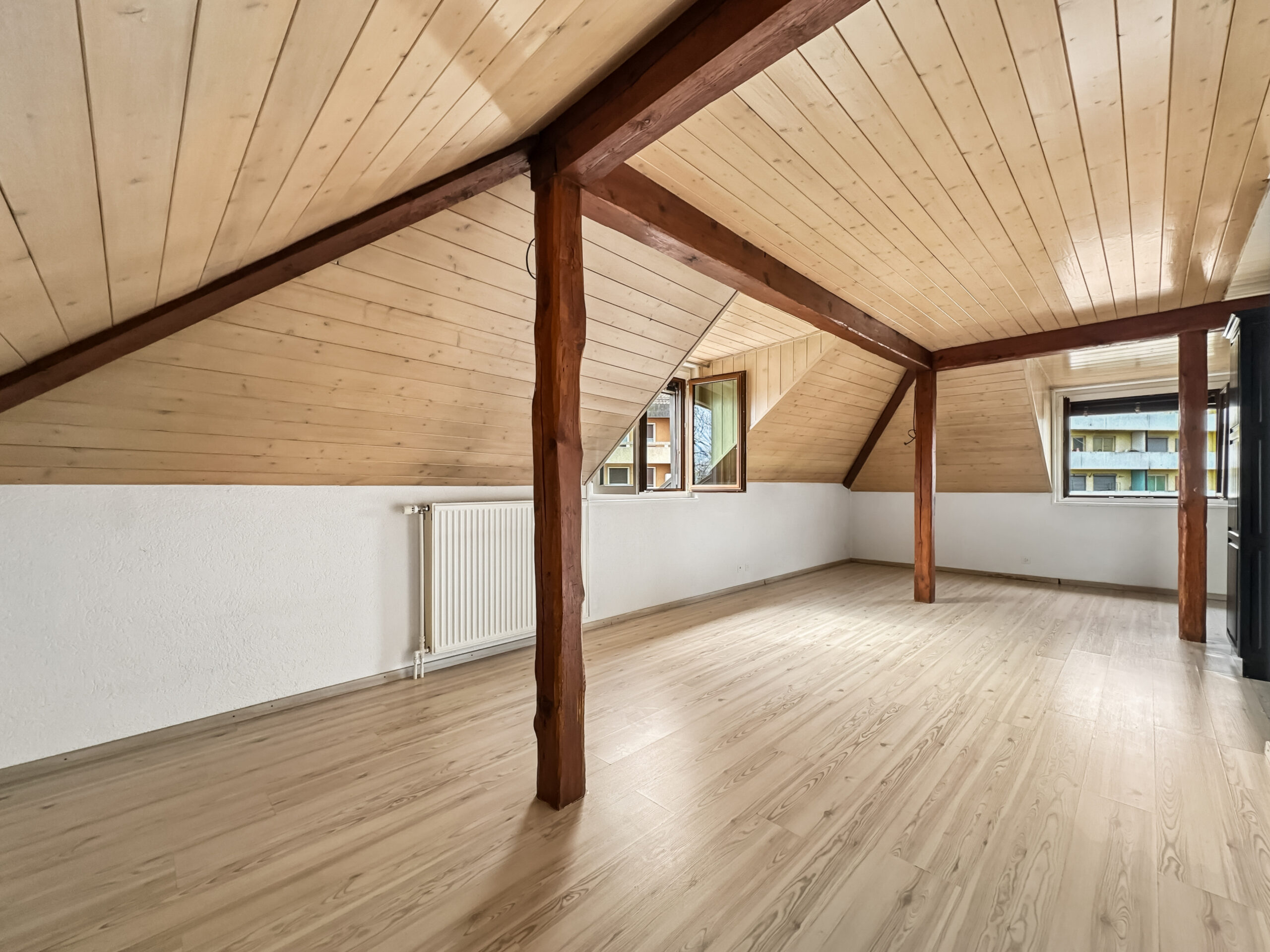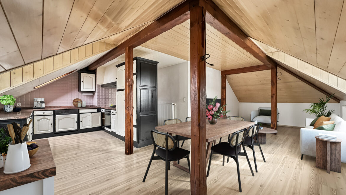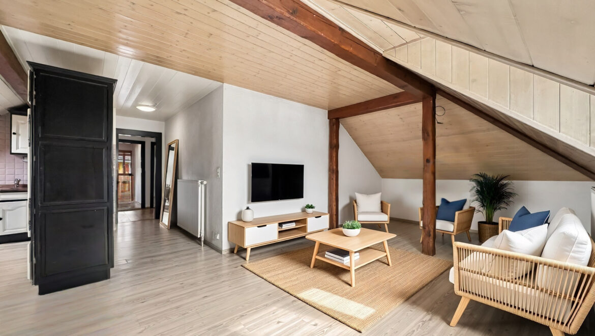 Cette maison locative comprend 5 appartements sans ascenseur. Ce sont les combles que nous mettons en vente, un appartement de 5,5 pièces qui occupe tout l’étage, face à la Thielle, qui vous donnera l’impression de vivre dans un cadre à la fois paisible et privilégié.