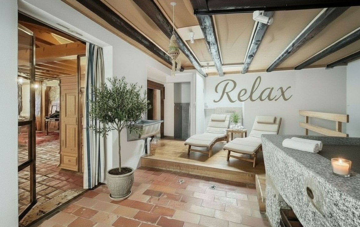 Lors de la première rénovation, le local où se trouve le pressoir était un SPA, bassin-piscine, sauna. La piscine a été recouverte d’un plancher. Avec les propriétaires actuels, le local-pressoir était un local de poterie & sauna.