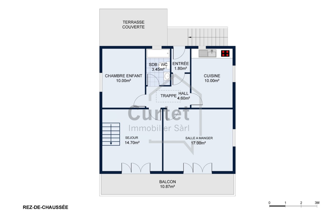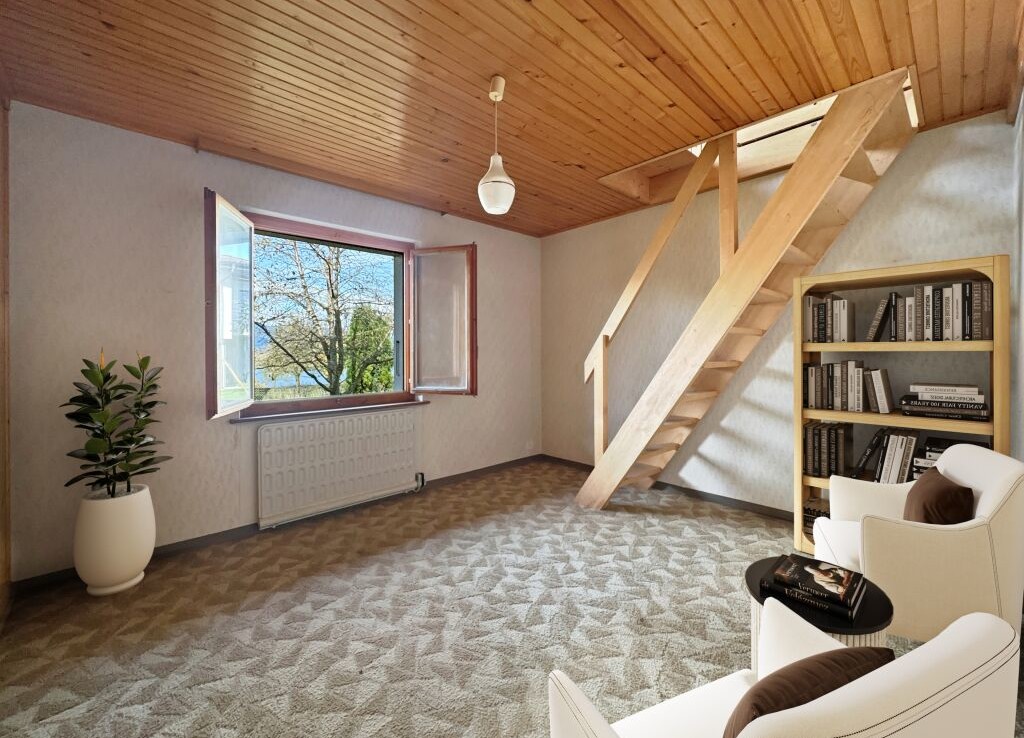 A la base, le 1er étage était accessible uniquement de l’extérieur et les propriétaires actuels ont décidé de créer un escalier à l’intérieur dans l’une des chambres. Cet escalier pourrait tout à fait être déplacé si vous le souhaitez pour gagner une pièce supplémentaire.