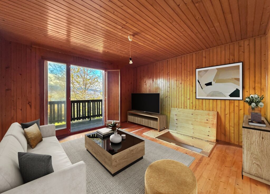 Ce joli chalet typique, avec tout le rez-de-chaussée en béton a été construit en 1973, si vous aimez le bois il vous enchantera. Il offre un cadre de vie parfait pour un couple ou petite famille.
